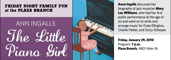 Ann Ingalls discusses her new children's book The Little Piano Girl, a biography of Mary Lou Williams, one of the most accomplished women in jazz, on Friday, January 29, at 7 p.m. in the Art Spot at the Plaza Branch, 4801 Main St.