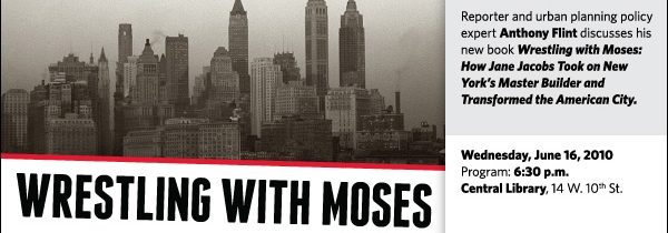 Reporter and urban planning policy expert Anthony Flint discusses his new book Wrestling with Moses: How Jane Jacobs Took on New York’s Master Builder and Transformed the American City on Wednesday, June 16, at 6:30 p.m. at the Central Library, 14 W. 10th St.