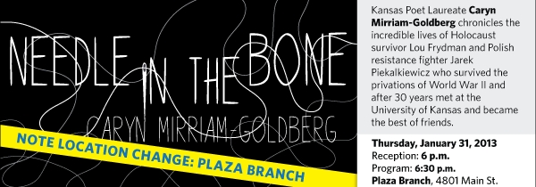 Kansas Poet Laureate Caryn Mirriam-Goldberg discusses her new book Needle in the Bone about the incredible lives of a Holocaust survivor (Lou Frydman) and a member of the Polish resistance (Jarek Piekalkiewicz) who somehow endured extraordinary privations during World War II and after 30 years met at the University of Kansas and became good friends.