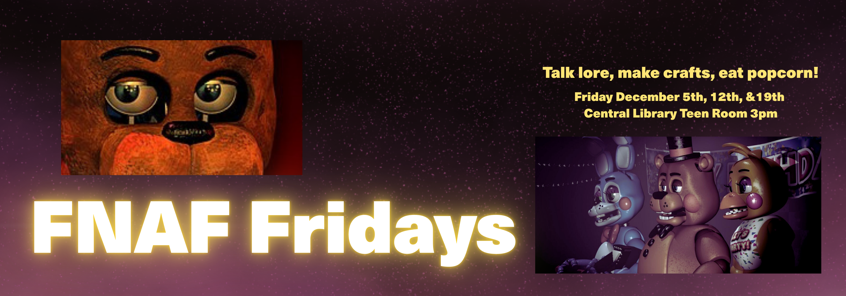 Celebrate the new Five Nights at Freddy's (FNAF) movie with FNAF Fridays. Watch lore videos, eat popcorn, and participate in crafts and activities every Friday in December until Winter Break!