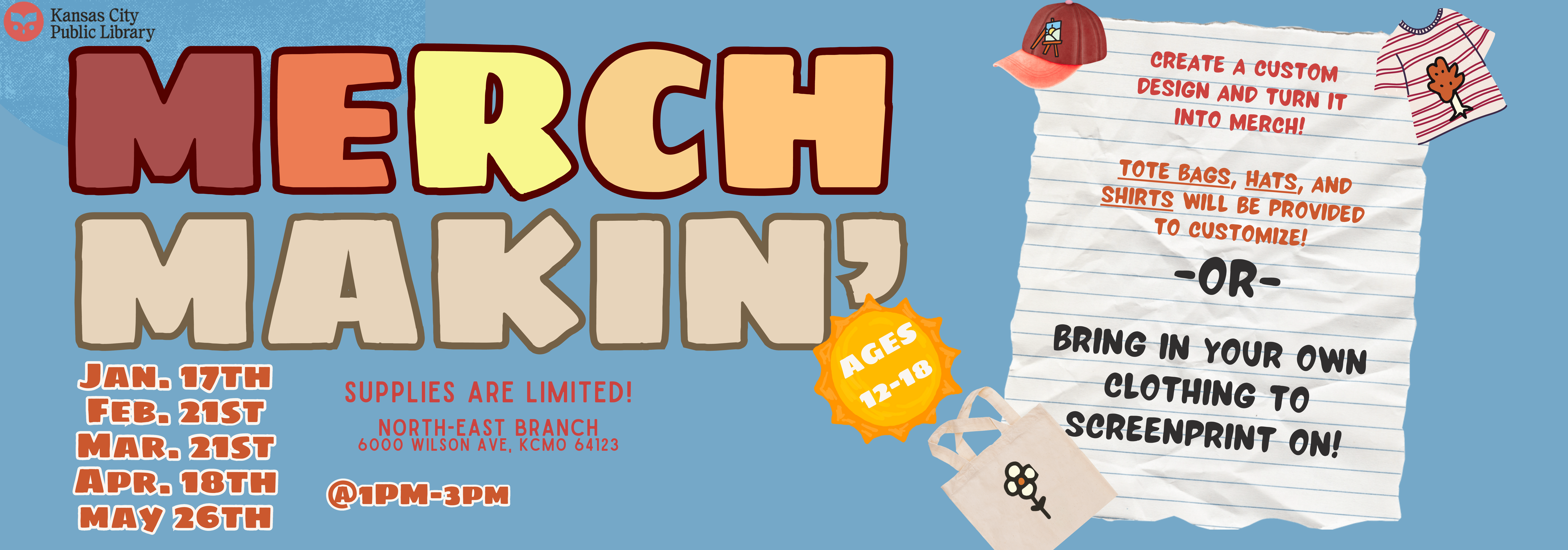 Create a custom design and turn it into merch! Tote bags, hats, and shirts will be provided to customize or bring in your own clothing to design on.