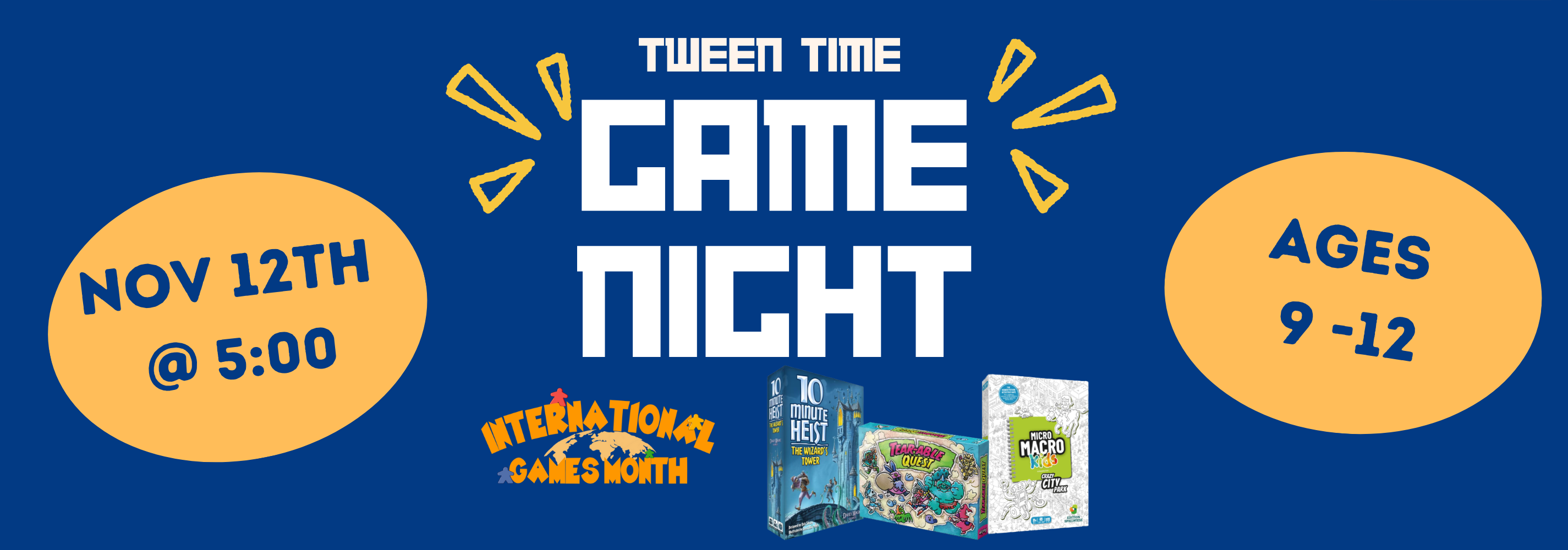It's International Games Month and we're celebrating with a special tween game night in November! Tweens ages 9-12 are invited to join us for snacks, new friends, and 3 easy-to-learn tabletop games.