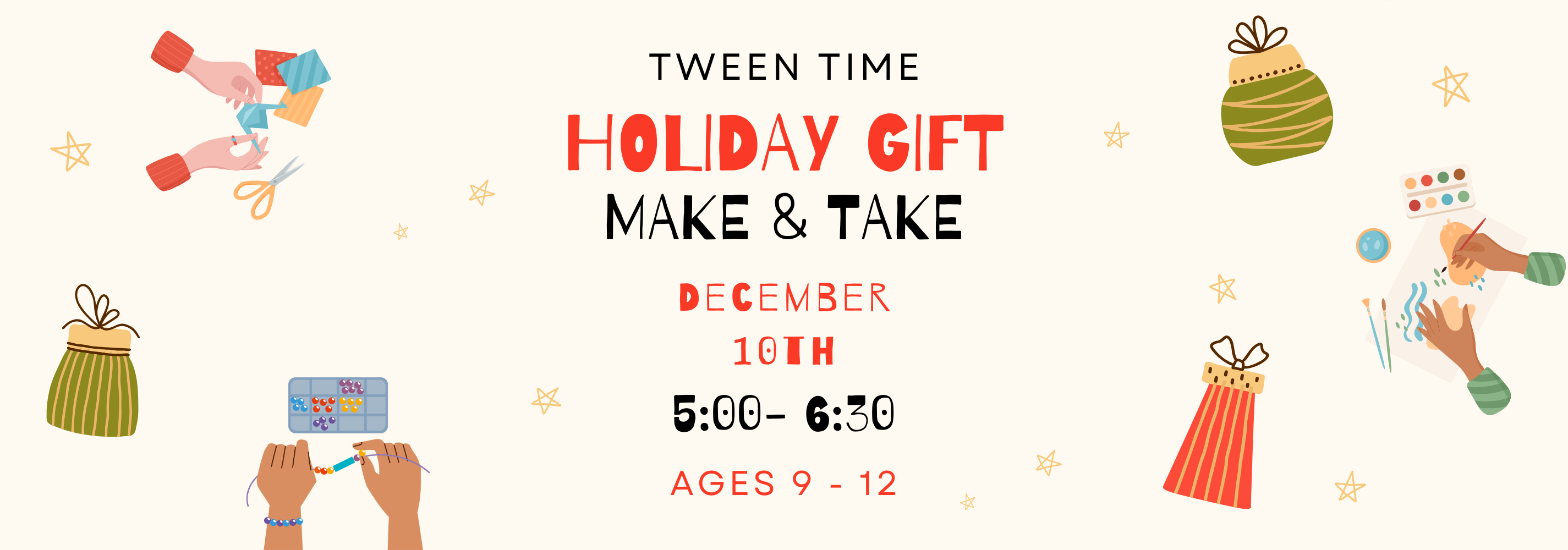 Tweens ages 9-12 can join us for snacks and silly videos as we make gifts for our loved ones (or ourselves)!