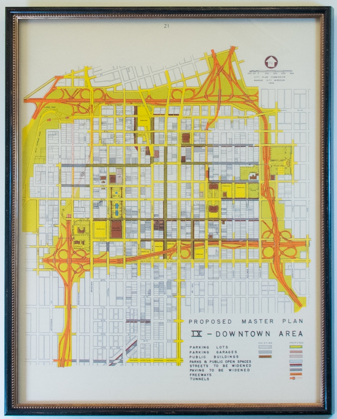 This map lays out the ninth Proposed Master Plan of the Downtown Area and was generated in 1946. The plan's primary feature is the expressway loop surrounding the gridded area. Existing and proposed parking arrangements, public spaces, street improvements, freeways, and tunnels are indicated in the legend with corresponding color and pattern on the map.