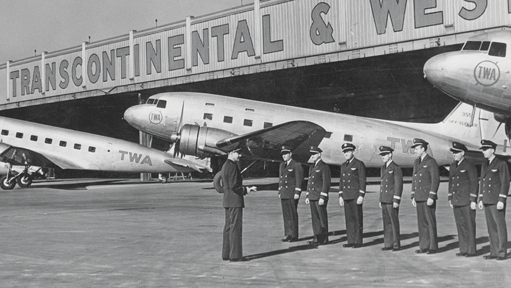 TWA passenger planes and pilots line up in front of the Transcontinental & Western Air hangar at Municipal Airport in the 1930s or ‘40s (Kansas City Aviation Department)