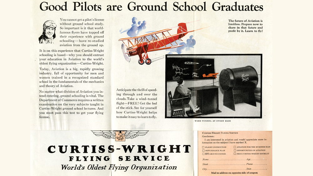 Brochure for the Curtiss-Wright Flying Service, circa 1930. Among the 24 aviation courses listed in side are Theory of Flight, Cross-Country Flying, Engines, Meteorology and Air Regulation. (Missouri Valley Special Collections)
