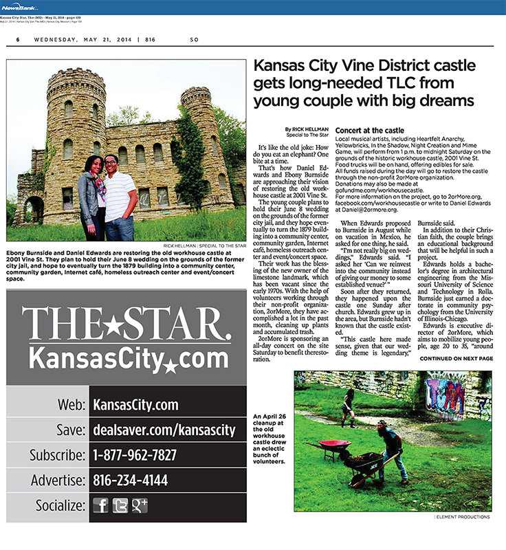 In 2007 the graffiti-strewn ruins were placed on the Kansas City Register of Historic Places. A few years later, Daniel and Ebony Edwards made headlines with their grassroots quest to reinvent the castle as a one-of-a-kind community center. They removed tons of trash and debris, and even held their wedding there, but ultimately failed to find the funding such an endeavor would require.