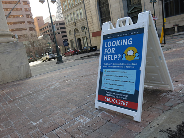 Outside the downtown Central Library, a sign invites patrons to connect with the Community Resource team and its services.