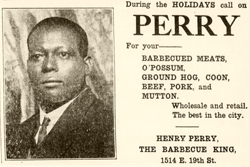 Perry pitched his tent where his barbecue would sell. In time, he gave up finding other jobs, settling into brick-and-mortar locations, first at 19th and Vine and later at 19th and Highland. By the time of the 1930 census, Perry reported the following: “Occupation – Barbecue; Industry – Barbecue.” The King had claimed his realm.