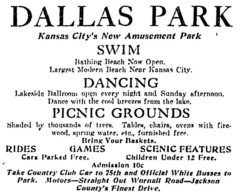 In addition to its famous resident, the town boasted a post office, several businesses, schools, and homes. In the 1920s, Dallas became a bit of a destination spot for Kansas Citians when the new entertainment hub, Dallas Park, opened. A May 26, 1922, article in The Kansas City Star detailed the features of the new park, including a lake for swimming and boating, overlooked by a dance pavilion. Additional attractions ranged from children’s swings and a merry-go-round to picnic tables, outdoor ovens, tennis courts, baseball fields, and a restaurant. The park was to open on Memorial Day of that year. Sadly, the lake’s bathing beach wouldn’t be ready for another month.