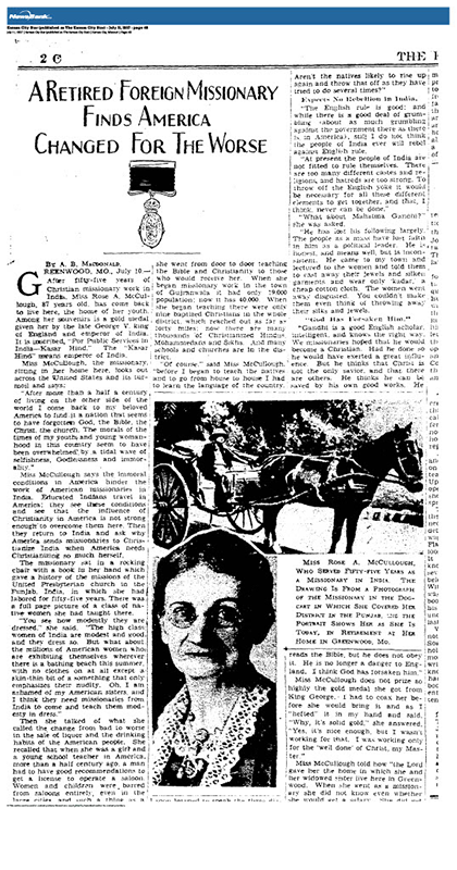 A Star story in 1940 marking her 90th birthday said, “Miss McCullough was the first woman missionary to go into native villages and live under primitive hardships to carry on the evangelistic program.” King George V of Great Britain awarded her the Kaisar-I-Hind medal for outstanding public service.
