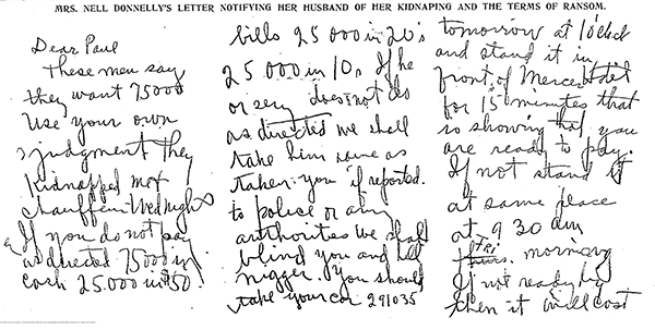 Donnelly was forced to write a ransom note for $75,000 (more than $1.3 million today). The kidnappers threatened if that she did not comply, they would kill Blair and permanently blind her. The note was delivered the next morning to the offices of Donnelly’s lawyers.