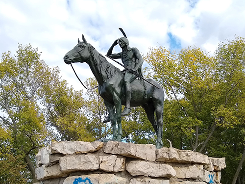 Standing just over 10 feet tall and weighing 1.75 tons, The Scout was originally created for the 1915 Panama-Pacific Exposition in San Francisco, California, by sculptor Cyrus E. Dallin. Dallin was born and raised in the 1860s and 1870s in Utah, and had frequent interactions with Native Americans during his childhood. As his artistic career progressed, he gained national and professional notoriety for his sculptures depicting Native Americans.