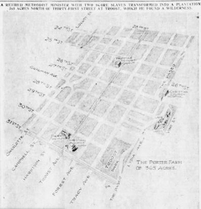 However, the Rev. James Porter did. Porter was Kansas City’s first Methodist preacher. His family established the Porter Plantation, where they enslaved between 40 to 100 people, in 1834. It was bordered by 23rd and 31st streets on the north and south and from Locust Avenue to Vine Street, taking up about 365 acres.