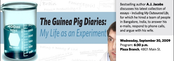 Bestselling author A.J. Jacobs discusses his newest book The Guinea Pig Diaries: My Life as an Experiment on Wednesday, September 30, at 6:30 p.m. in the Truman Forum at the Plaza Branch, 4801 Main St.
