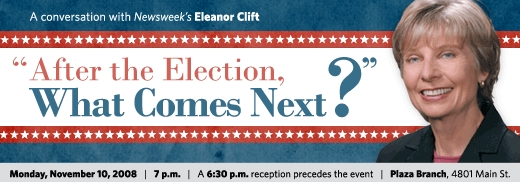 The Kansas City Public Library, in cooperation with KCPT, hosts a conversation with Eleanor Clift in the program After the Election, What Comes Next? on Monday, November 10, at 7 p.m. in the Truman Forum at the Plaza Branch, 4801 Main St.