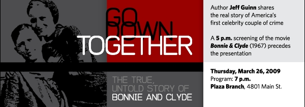 On Thursday, March 26, at 7 p.m. at the Plaza Branch, 4801 Main St., acclaimed author Jeff Guinn debunks some of the glamorous myths of America’s first celebrity couple of crime with his book Go Down Together: The True, Untold Story of Bonnie and Clyde.