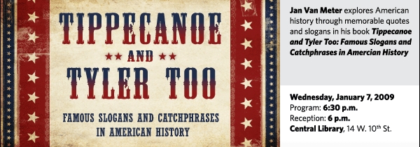 On Wednesday, January 7, at 6:30 p.m. at the Central Library, 14 W. 10th St., Jan R. Van Meter discusses his debut book Tippecanoe and Tyler Too: Famous Slogans and Catchphrases in American History.
