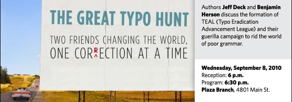 Jeff Deck and Benjamin Herson discuss their new book, The Great Typo Hunt, on Wednesday, September 8, at 6:30 p.m. at the Plaza Branch, 4801 Main St.