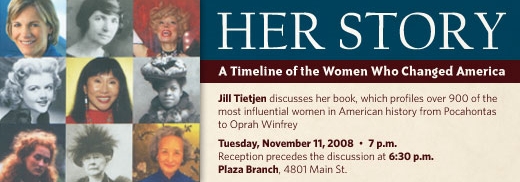 On Tuesday, November 11, at 7 p.m. at the Plaza Branch, 4801 Main St., Jill Tietjen discusses her book, Her Story: A Timeline of the Women Who Changed America.