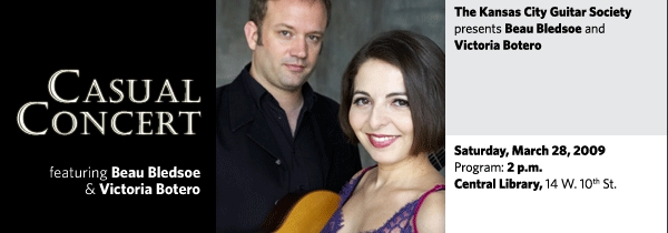 The Kansas City Guitar Society presents Beau Bledsoe and Victoria Botero as part of its regular Casual Concert Series on Saturday, March 28 at 2 p.m. at the Central Library, 14 W. 10th St.