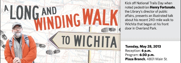 It wasn’t exactly akin to the scaling the Matterhorn, but for noted pedestrian Henry Fortunato, the Library’s director of public affairs, his Long and Winding Walk to Wichita last October was quite the amazing – and often amusing – adventure nonetheless. Gear up for National Trails Day (Saturday, June 1) when Fortunato presents an illustrated talk about his 240-mile trek that began at his front door in Overland Park.