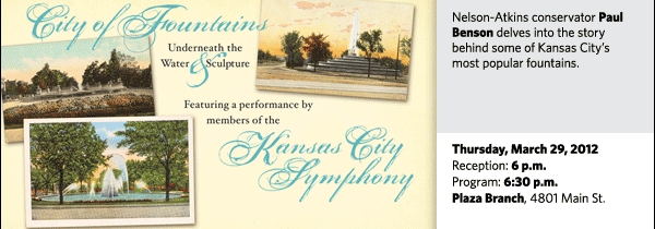 The event is part of the Kansas City Symphony’s City of Fountains Celebration, which has commissioned several new works inspired by the city’s fountains. During the program an ensemble of Symphony musicians will perform part of Daniel Kellogg’s Water Music, which premieres on March 30-April 1.