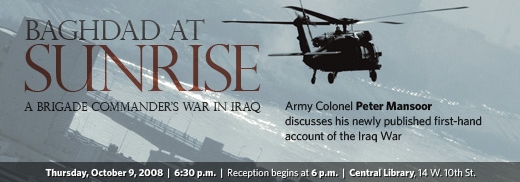 Colonel (retired) Peter Mansoor discusses his new book Baghdad at Sunrise: A Brigade Commander’s War in Iraq on Thursday, October 9, at 6:30 p.m. at the Central Library, 14 W. 10th St.