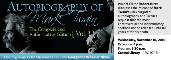 Robert Hirst, general editor and official curator of the Mark Twain Papers and Project at the University of California – Berkeley, discusses the release of Twain’s unexpurgated autobiography on Wednesday, November 10, 2010, at 6:30 p.m. at the Central Library, 14 W. 10th St.