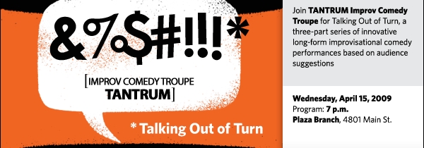 Improvisational comedy troupe TANTRUM is Talking Out of Turn with its unique style of long-form improv performance on Wednesday, April 15, at 7 p.m. in the Truman Forum at the Plaza Branch, 4801 Main St.