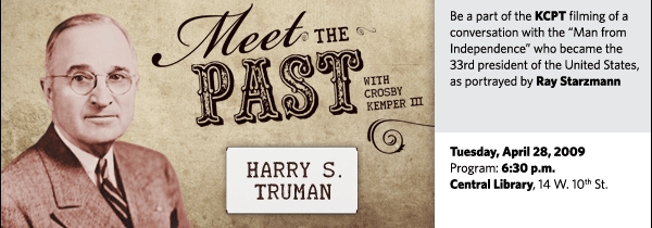 Kansas City Public Library Director Crosby Kemper III interviews President Harry S. Truman, portrayed by Ray Starzmann, as part of the Library’s Meet the Past series on Tuesday, April 28, at 6:30 p.m. at the Central Library, 14 W. 10th St.