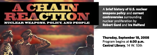 A Chain Reaction: Nuclear Weapons, Policy, and People will be presented by Lt. Gen. (retired) Robert Gard, chairman of the Center for Arms Control and Non-Proliferation, and Dr. Ira Helfand, co-founder of the national Physicians for Social Responsibility.