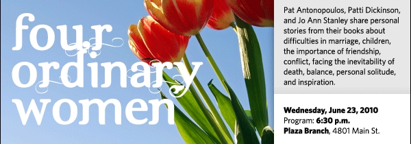 Pat Antonopoulos, Patti Dickinson, and Jo Ann Stanley present selections from Four Ordinary Women: A Gathering at the Cedar Roe Library, their compelling collection of the stories of their lives that began as a writing group at a branch of the Johnson County Library.