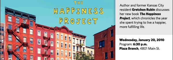Author Gretchen Rubin discusses her new book The Happiness Project: Why I Spent a Year Trying to Sing in the Morning, Clean My Closets, Fight Right, Read Aristotle, and Generally Have More Fun on Wednesday, January 20, at 6:30 p.m. at the Plaza Branch, 4801 Main St.