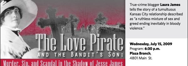 On Wednesday, July 15, at 6:30 p.m. at the Plaza Branch, 4801 Main St., true-crime blogger Laura James tells the story of sex, deceit, money, and murder when she discusses her book The Love Pirate and the Bandit's Son: Murder, Sin, and Scandal in the Shadow of Jesse James.
