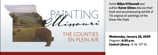Artist Billyo O’Donnell and author Karen Glines present an illustrated talk about the Painting Missouri Exhibit and their book Painting Missouri: The Counties en Plein Air on Wednesday, January 28, at 6:30 p.m. at the Central Library, 14 W. 10th St.