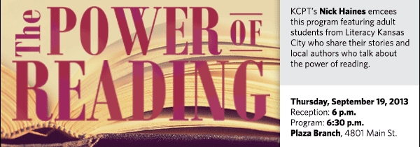 To celebrate the joy of literacy the Library hosts the fifth annual Power of Reading: A Celebration of the Written Word. KCPT’s Nick Haines emcees. Adult students from Literacy Kansas City share their stories. And local writers – among them The Recipe (featuring Theodore “Priest” Hughes and Desmond “337” Jones), Chato Villalobos, Grace Suh, and Judith Fertig - discuss the power of reading in their lives.
