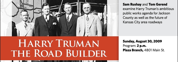 The Truman Legacy series returns to The Kansas City Public Library, featuring Sam Rushay and Tom Gerend as they examine Harry Truman the Road Builder: A Look Forward from 1920 to 2040 on Sunday, August 30, at 2 p.m. at the Plaza Branch, 4801 Main St.