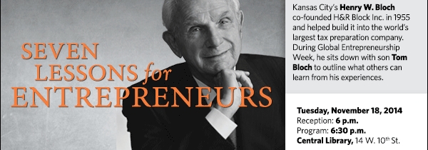 Now 92, he sits down with his son, Tom Bloch, for a conversation covering seven timeless lessons for entrepreneurs gleaned from his experiences. The presentation is held in conjunction with Global Entrepreneurship Week and the paperback release of the younger Bloch’s 2010 book Many Happy Returns: The Story of Henry Bloch, America’s Tax Man.