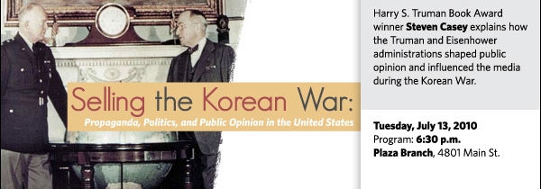 Steven Casey discusses his new book Selling the Korean War: Propaganda, Politics, and Public Opinion in the United States on Tuesday, July 13, at 6:30 p.m. at the Plaza Branch, 4801 Main St.