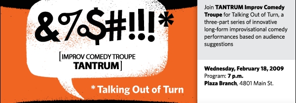Improvisational comedy troupe TANTRUM is Talking Out of Turn with its unique style of long-form improv performance on Wednesday, February 18, at 7 p.m. in the Truman Forum at the Plaza Branch, 4801 Main St.