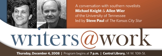 Michael Knight and Allen Wier join moderator Steve Paul of The Kansas City Star for the December talk in the Library’s Writers at Work series on Thursday, December 4, at 7 p.m. at the Central Library, 14 W. 10th St.